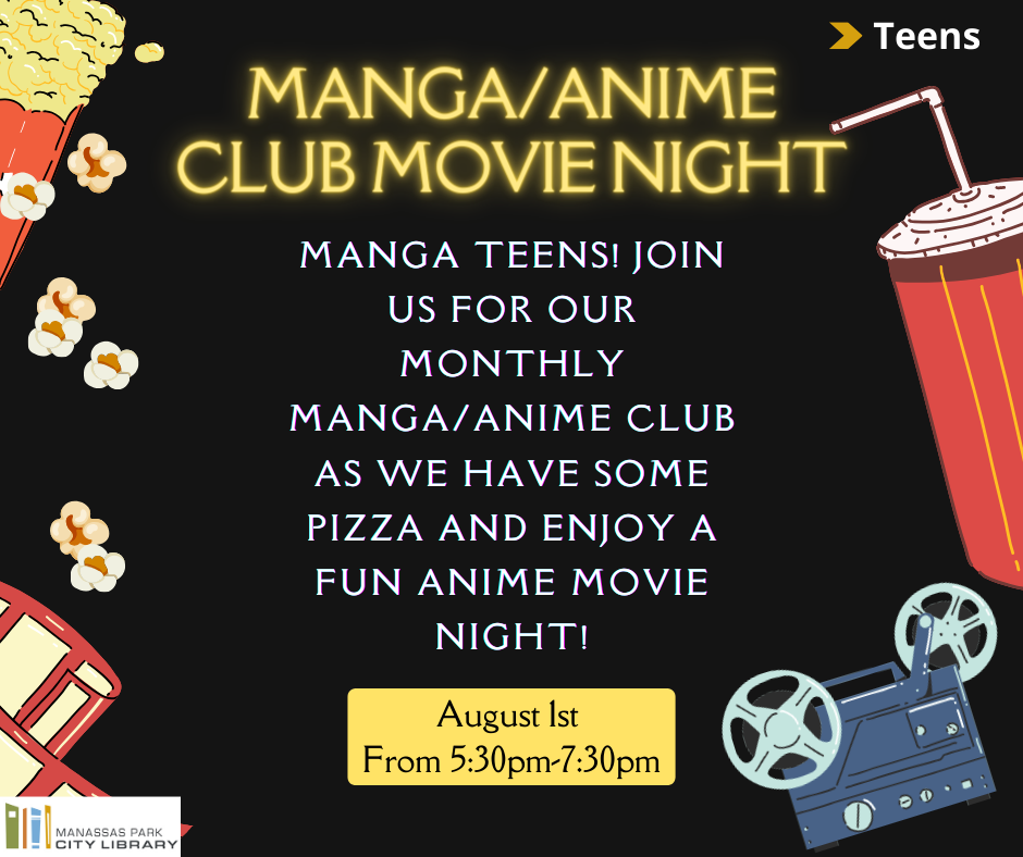 Manga teens! Join us for our monthly Manga/Anime club as we have some pizza and enjoy a fun Anime movie night!