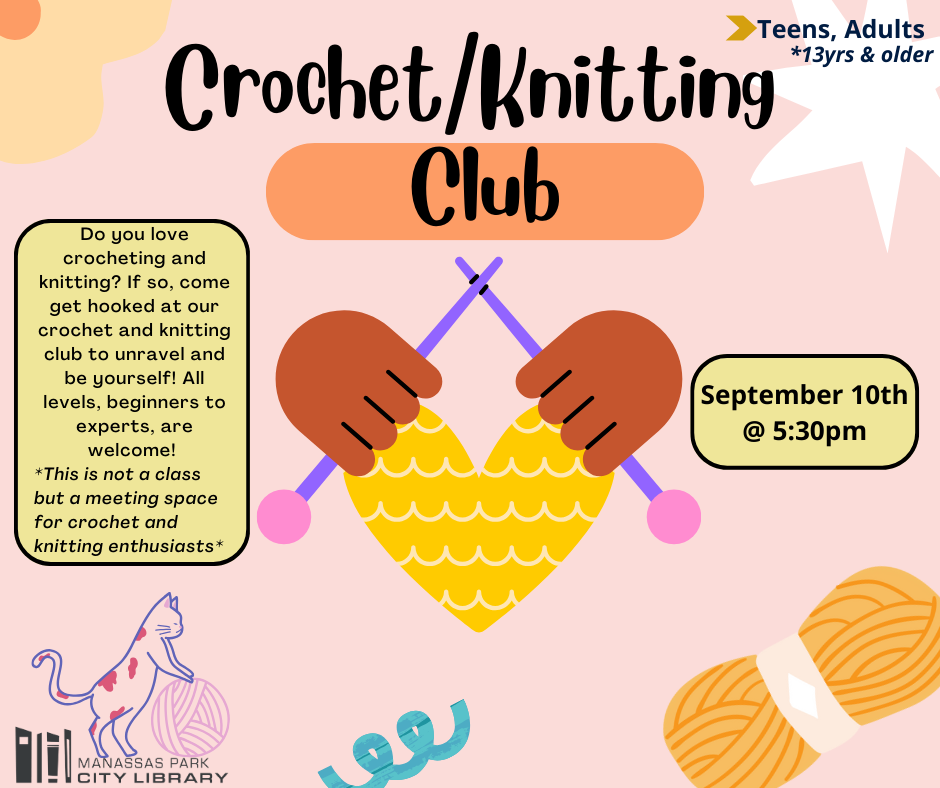 Do you love crocheting and knitting? If so, come get hooked at our crochet and knitting club to unravel and be yourself! All levels, beginners to experts, are welcome! We are currently making 10in granny squares to combine to make blankets for donations! *This is not a class but a meeting space for crochet and knitting enthusiasts*