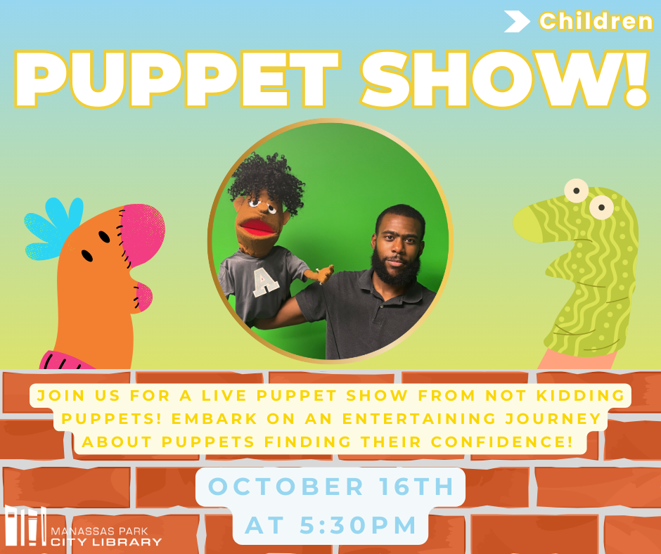 Join us for a live puppet show from Not Kiddin’ Puppets! Children will embark on an entertaining journey about puppets finding their confidence!