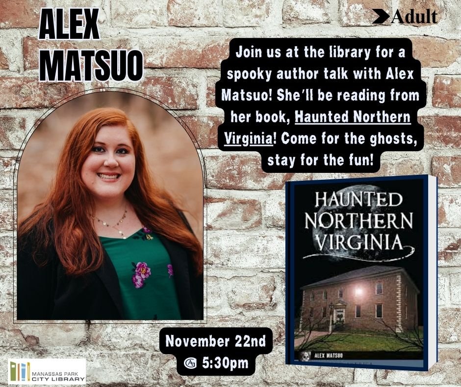 Join us at the library for a spooky author talk with Alex Matsuo! She’ll be reading from her book, Haunted Northern Virginia! Come for the ghosts, stay for the fun!