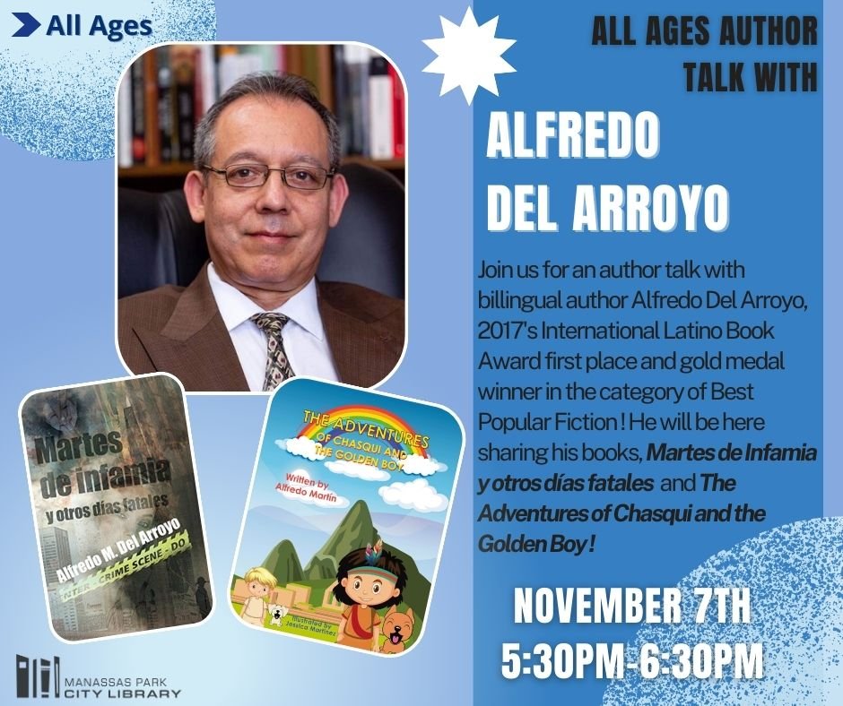 Join us for an author talk with billingual author Alfredo Del Arroyo, 2017's International Latino Book Award first place and gold medal winner in the category of Best Popular Fiction ! He will be here sharing his books, Martes de Infamia y otros días fatales and The Adventures of Chasqui and the Golden Boy!