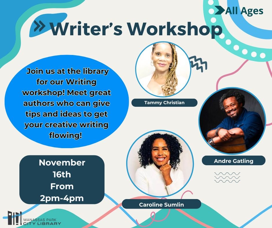 Have you ever wondered how to create your own storybook? Join us at the library for our Writing workshop! Meet actual authors who can give tips and ideas to get your creative writing flowing!