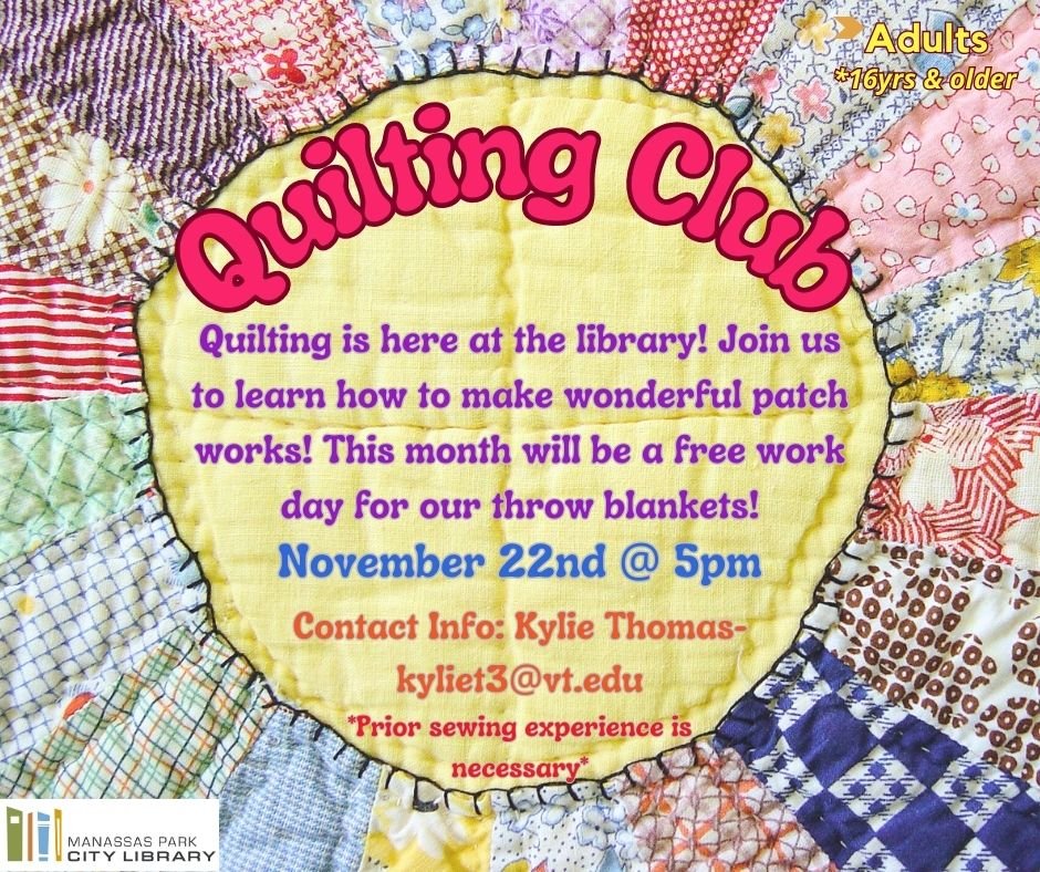 Quilting is here at the library! Join us to learn how to make wonderful patch works! This month will be a free work day for our throw blankets!