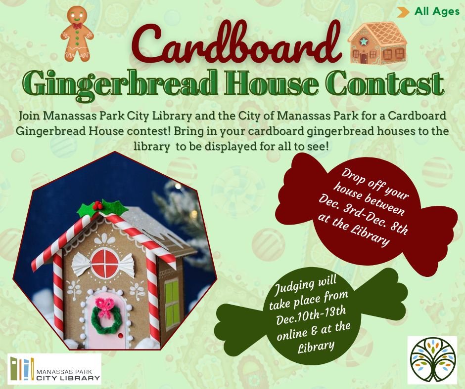 Join Manassas Park City Library and the City of Manassas Park for a Cardboard Gingerbread House contest! Bring in your cardboard gingerbread houses to the library to be displayed for all to see!