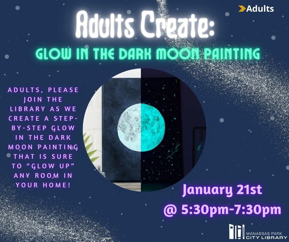 Adults, please join the library as we create a step-by-step glow in the dark moon painting that is sure to “Glow up” any room in your home!